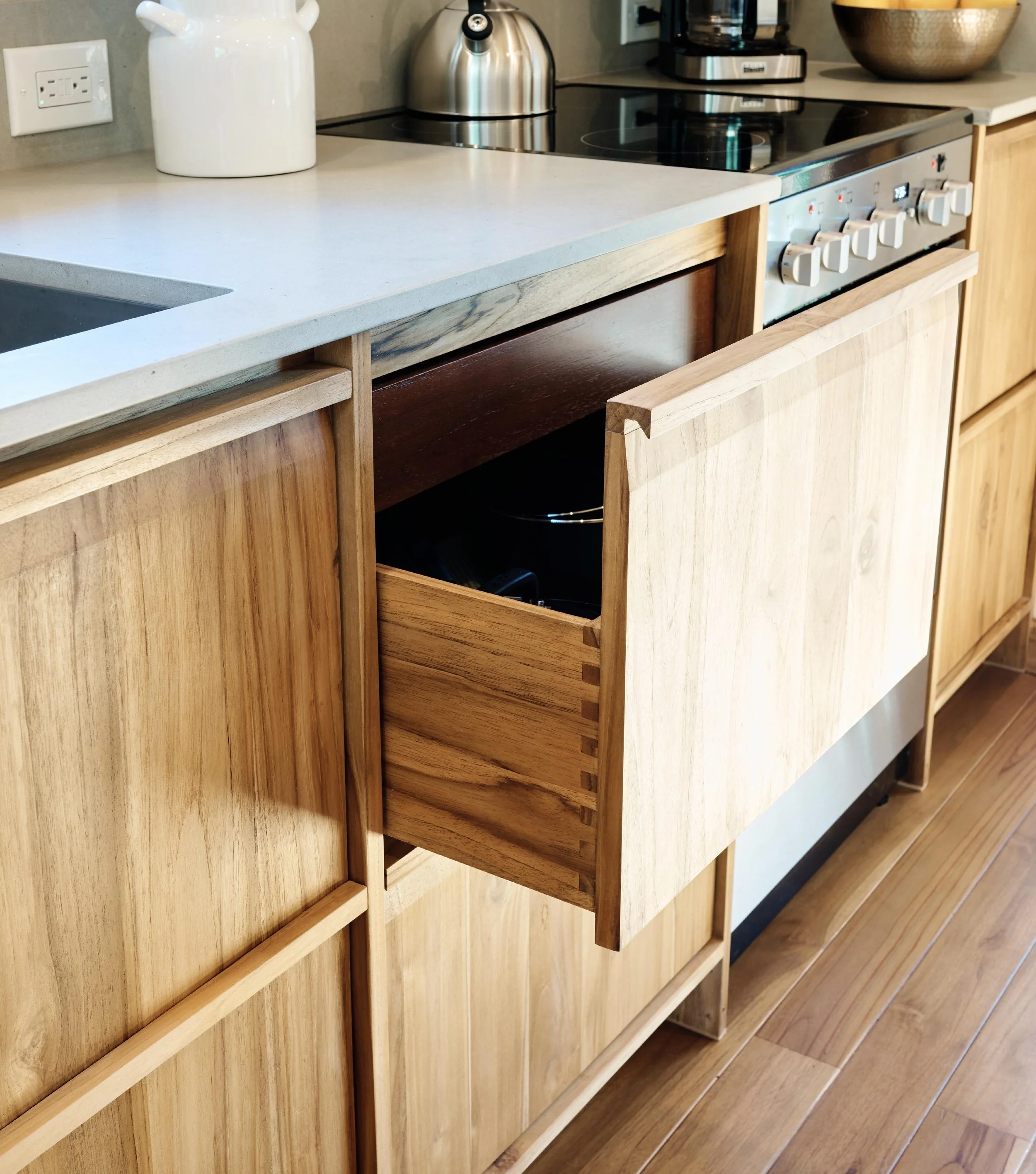 Panelized teak kit, insulation, windows, roofing, cabinetry, appliances and finishes.