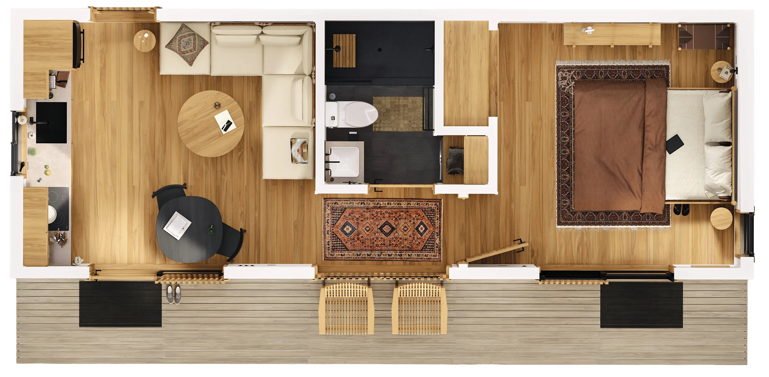 Panelized teak kit, insulation, windows, roofing, cabinetry, appliances and finishes.