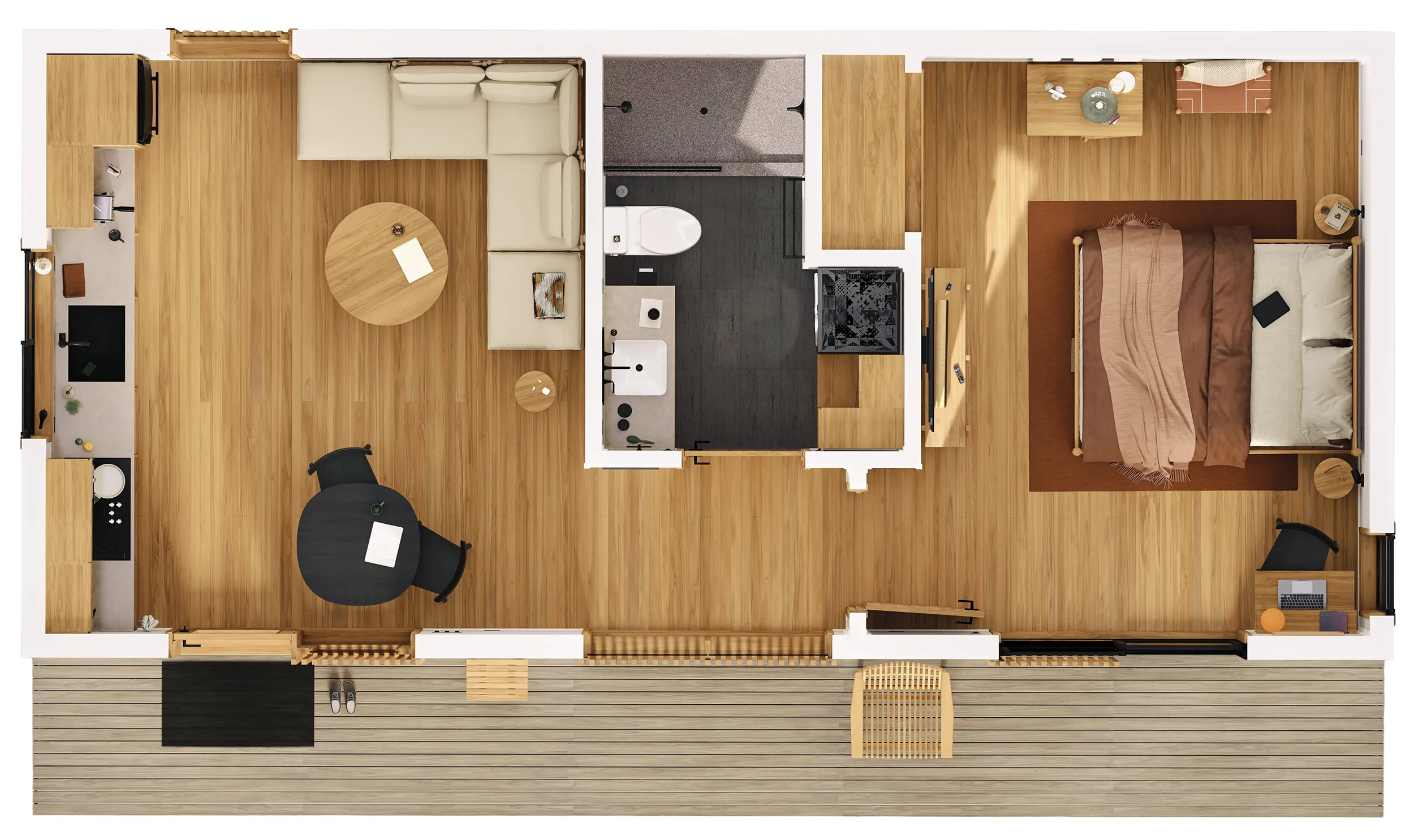 Panelized teak kit, insulation, windows, roofing, cabinetry, appliances and finishes.