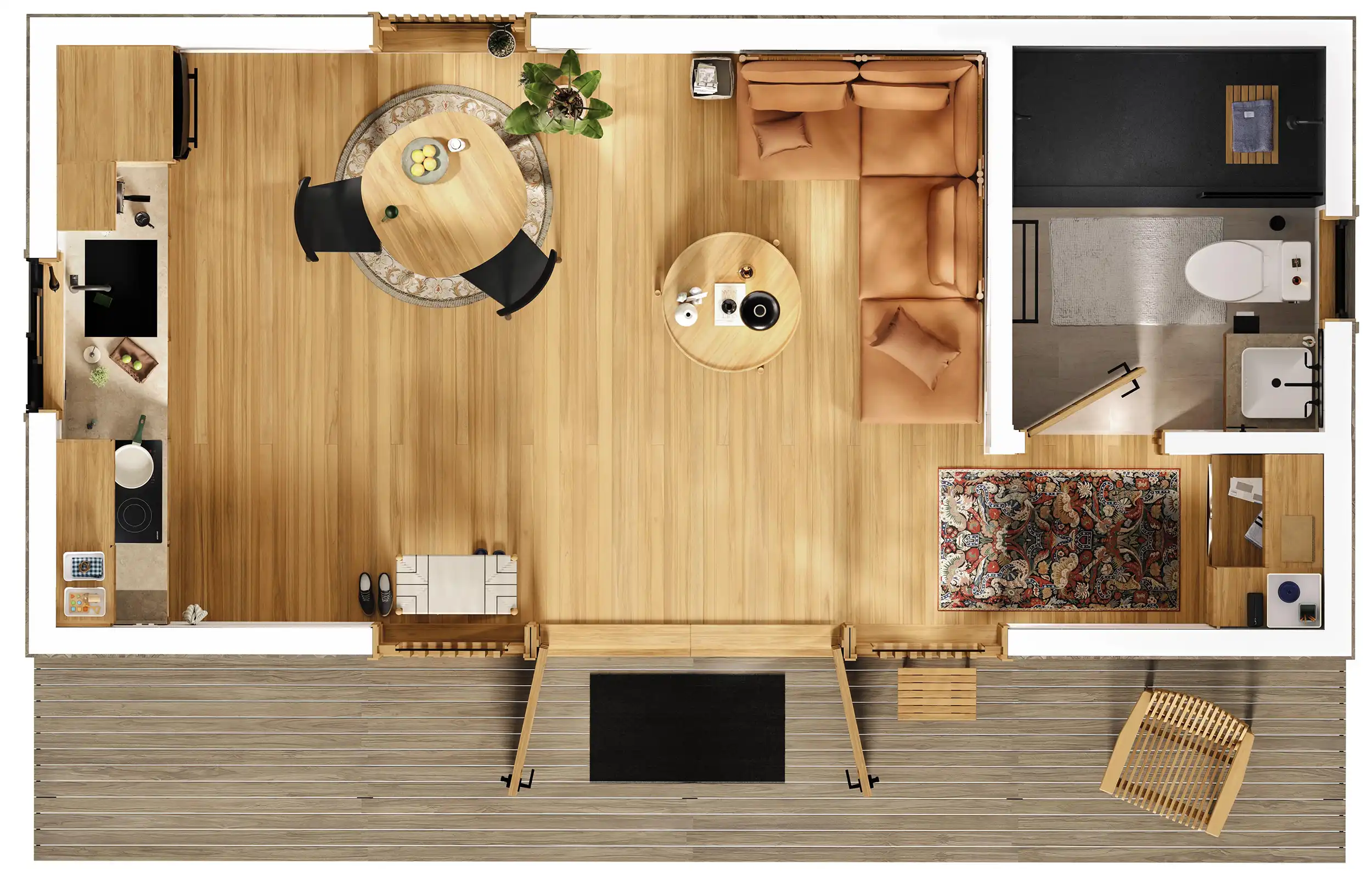 Panelized teak kit, insulation, windows, roofing, cabinetry, appliances and finishes.